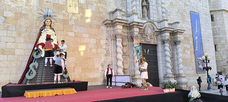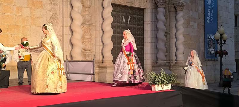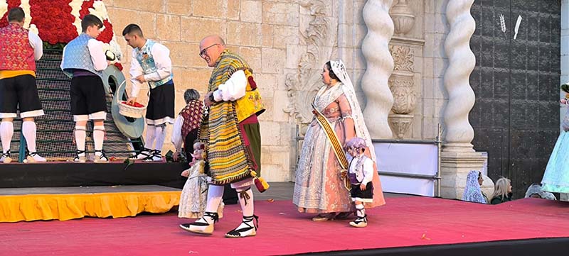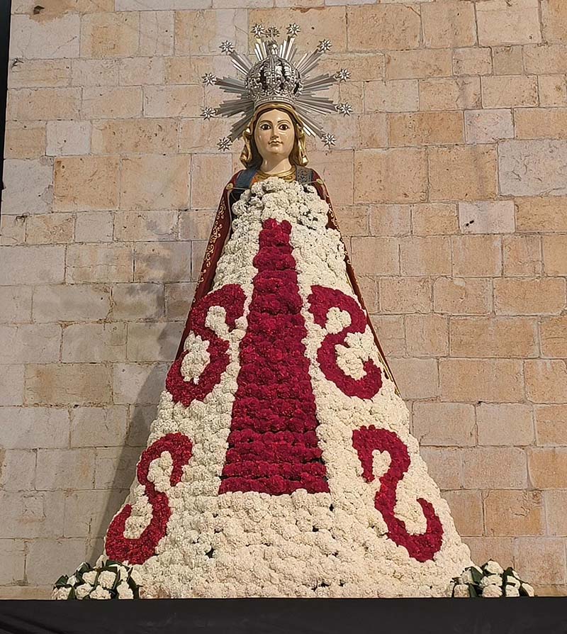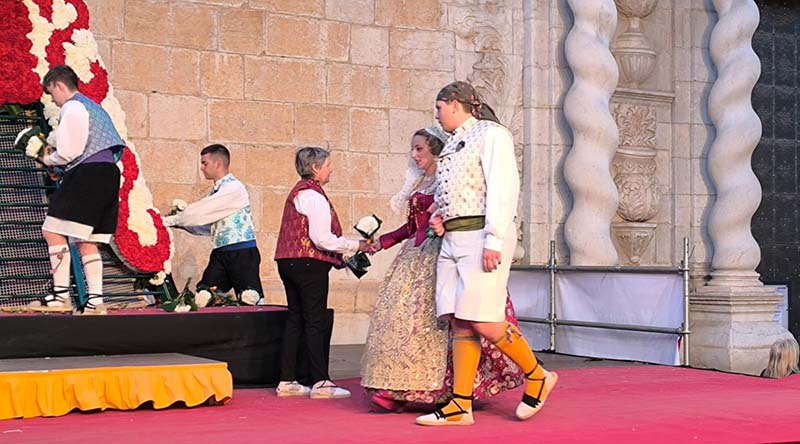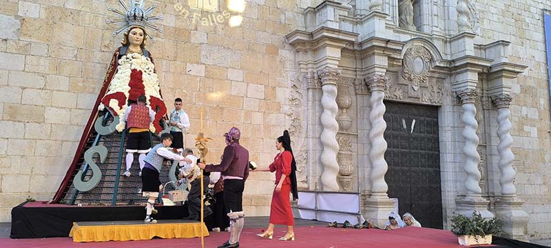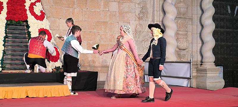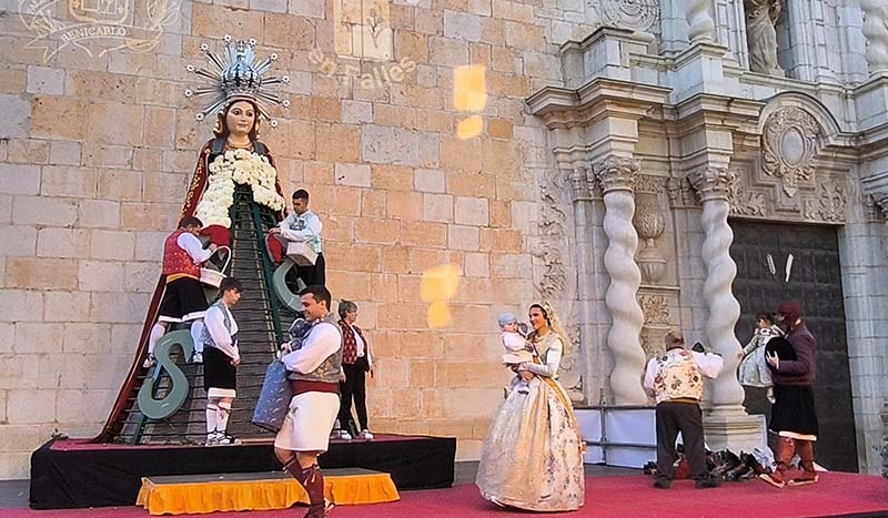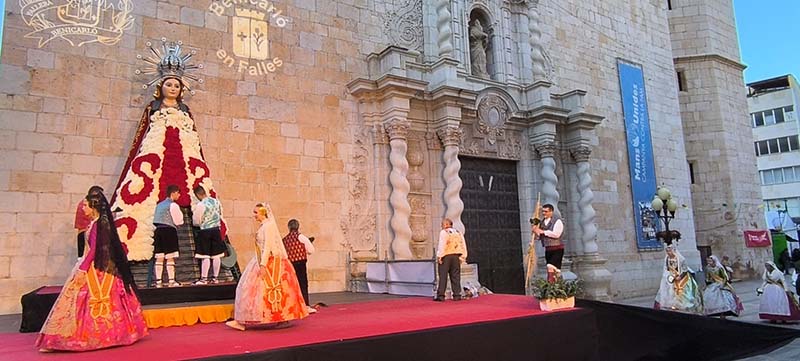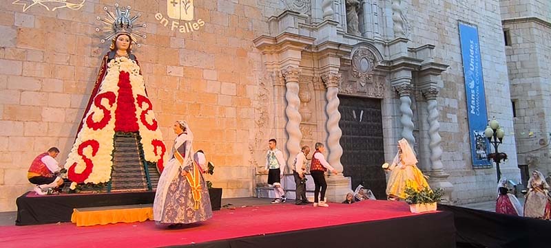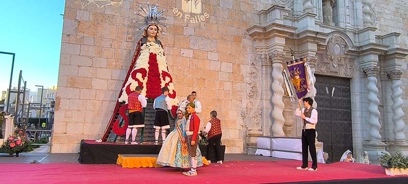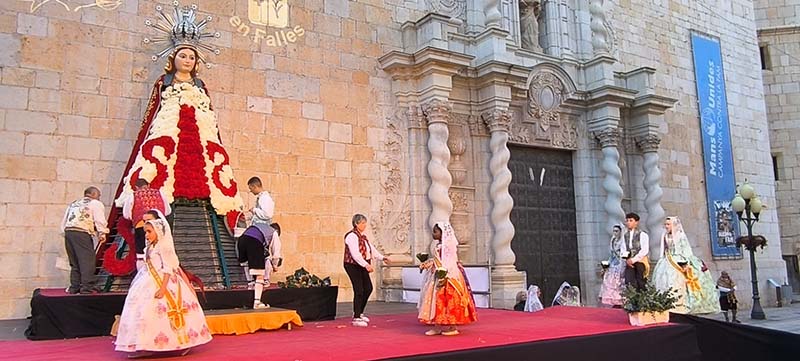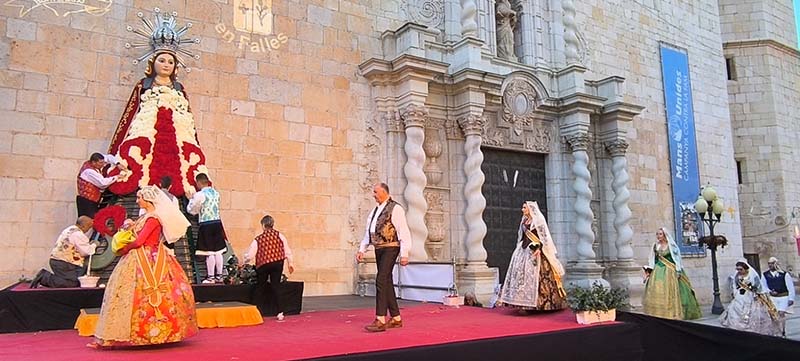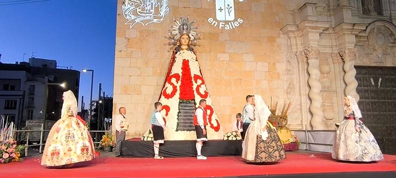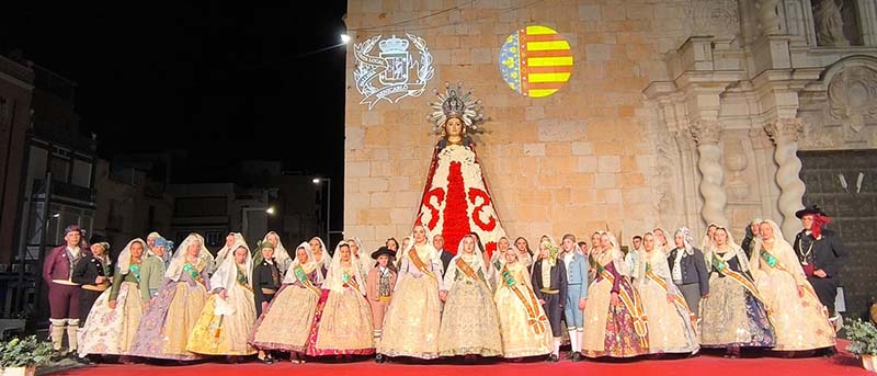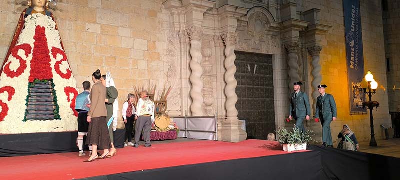 Milers de fallers i falleres han desfilat durant la vesprada per oferir els seus rams de clavells blancs i rojos a la patrona de la ciutat, conformant el tradicional mantell floral davant del temple parroquial.