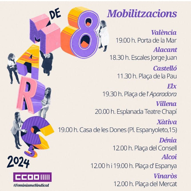 Dins dels actes del 8-M programats pel sindicat CCOO, se celebrarà una concentració a Vinaròs a les 12 del matí a la Plaça del Mercat sota el lema “Més Sindicalisme, Més Feminisme“.