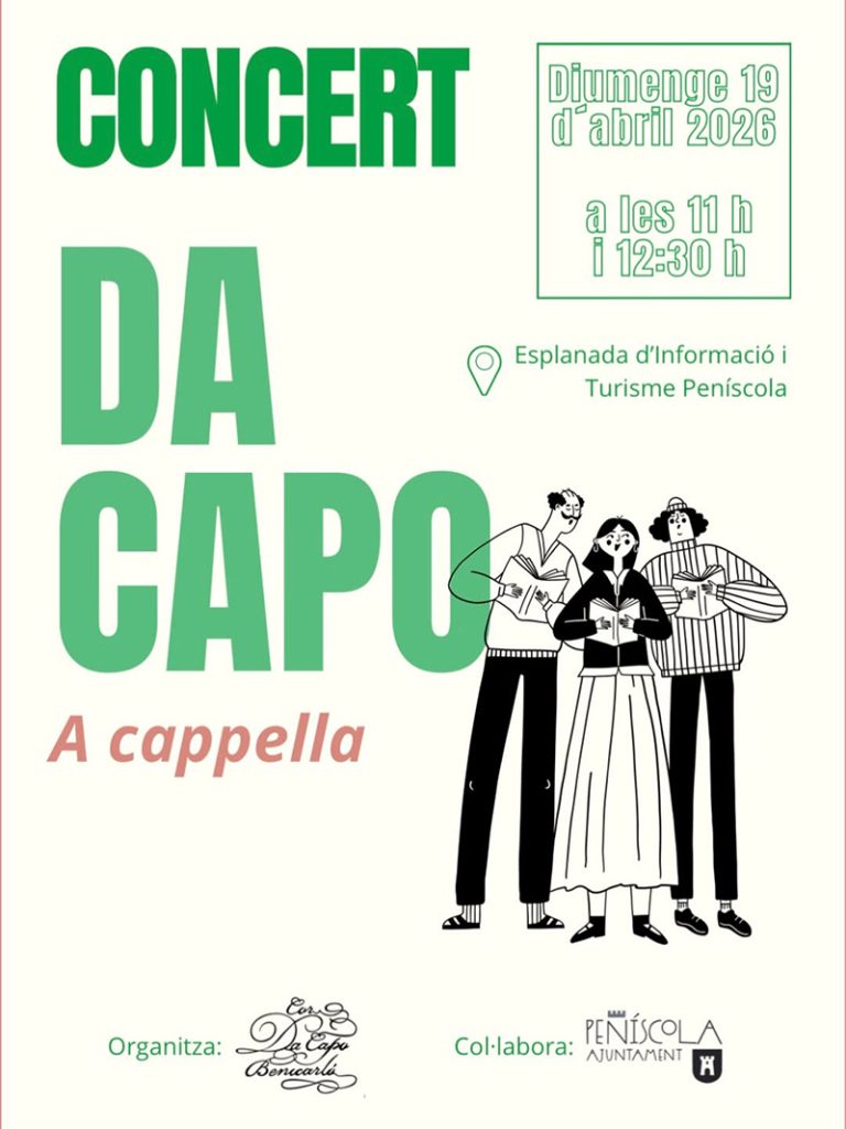 El grup Cor da Capo Benicarló oferirà un concert a l’esplanada de l’oficina d’informació turística, amb dues actuacions programades a les 11:00 i a les 12:30 hores, en un ambient festiu i obert a tots els públics.