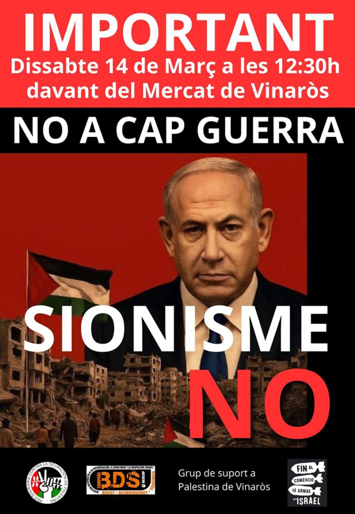 El passat dissabte estava convocada una concentració per Palestina davant del Mercat de Vinaròs, però per causes climàtiques va tindre que ajornar-se al dissabte 14 de març a les 12:30’ .