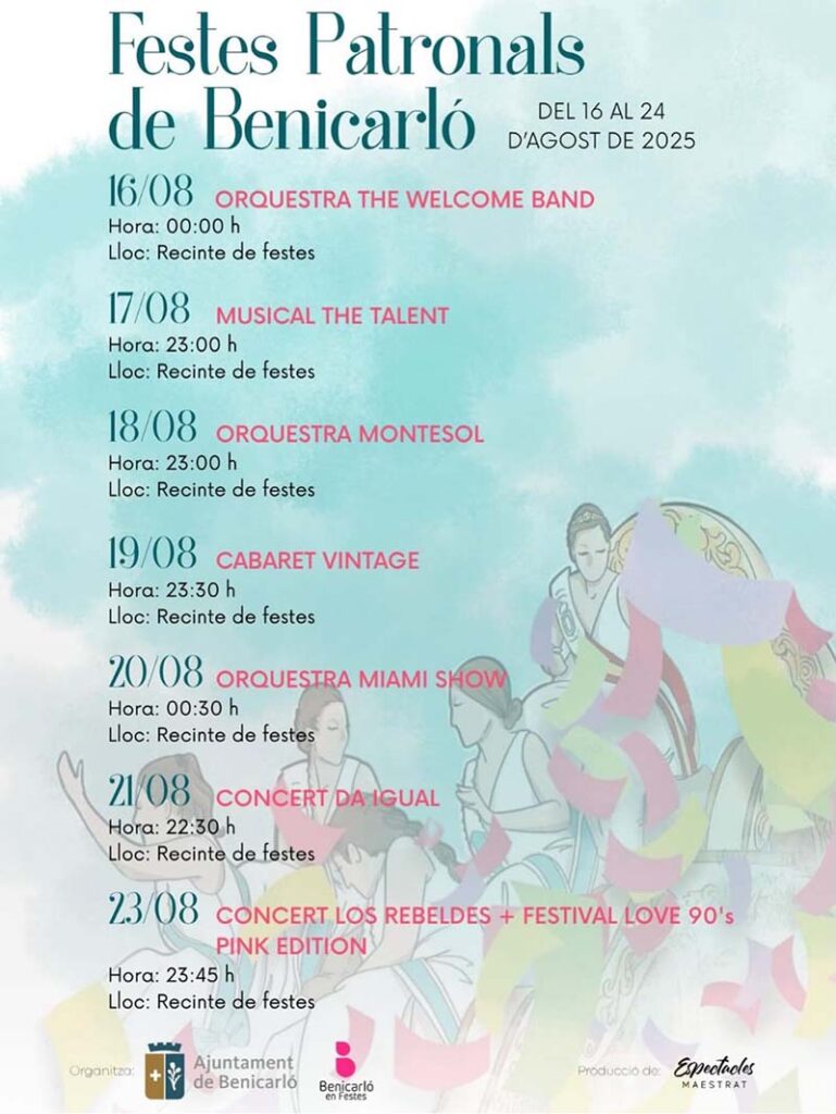 Del 16 al 24 d’agost viurem dies plens de música, tradició i alegria. Vine a gaudir de les actuacions, dels concerts, de la gastronomia i de tots els moments que fan d’estes festes una cita única.