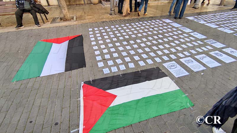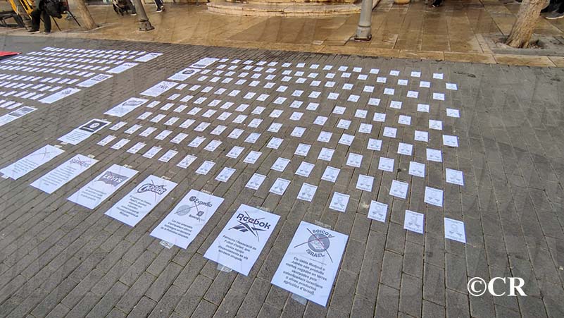 En el terra de l’Ajuntament s’han col·locat cartells amb empreses boicotejades pels seus lligams amb Israel, a més de 300 flyers amb el lema “Israel ha assassinat a més de 300 palestins des de l'”Alto Al Foc”.