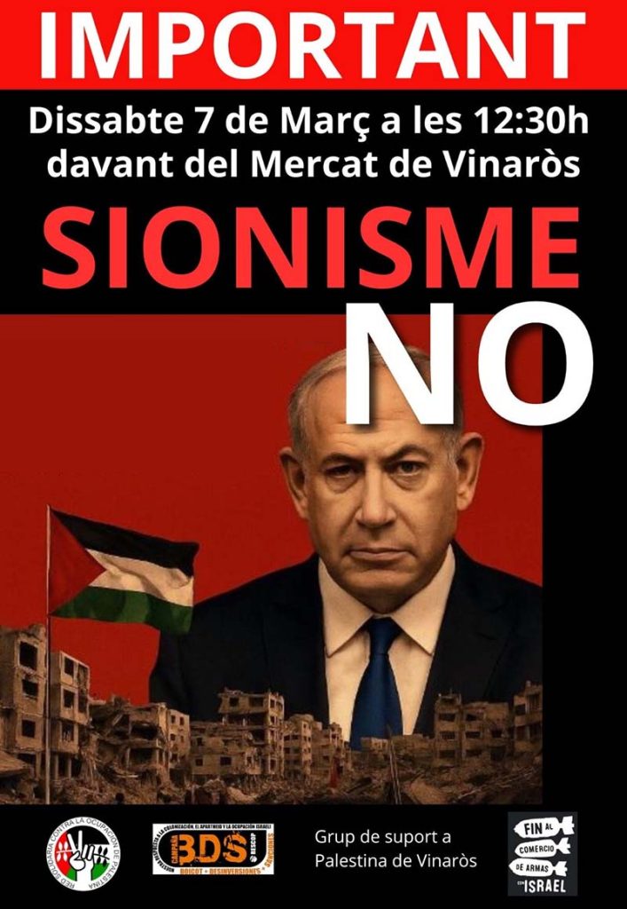 El Grup de Suport a Palestina de Vinaròs ha convocat, a través dels seus canals de difusió, una nova manifestació en la que “Vinaròs dirà no al sionisme, no al racisme i no al colonialisme”.