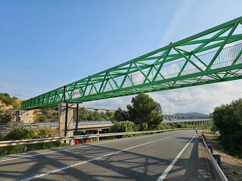 Es tracta d’una passarel·la metàl·lica en gelosia, de 90 metres de llargada total, amb dos vànols, el primer sobre l’autopista de 50 metres, i el segon, sobre la C-12, de 40 metres de llargada. Aquesta estructura es dona suport a mitjançant dos estreps i una pila intermèdia, tots ells de formigó armat. L’amplada de la passarel·la és de 3 metres, fet que permetrà el pas amb comoditat dels usuaris de la via verda.