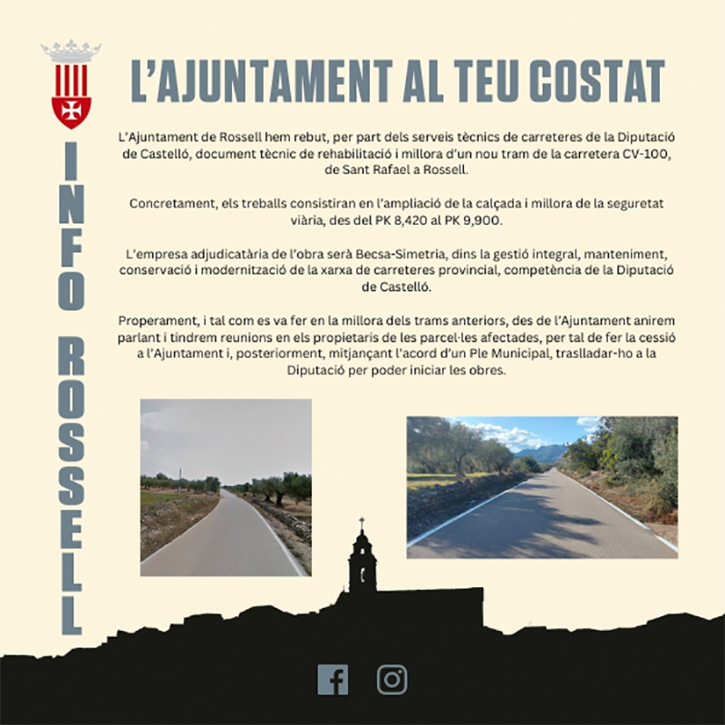 L’Ajuntament de Rossell hem rebut, per part dels serveis tècnics de carreteres de la Diputació de Castelló, document tècnic de rehabilitació i millora d’un nou tram de la carretera CV-100, de Sant Rafael a Rossell.