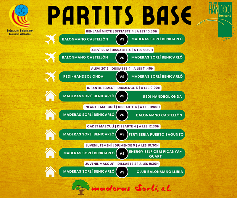 El Benjamí i l’Aleví 2012 jugaran enfront del Balonmano Castellón a Castelló. L’Aleví 2013, per la suea banda es desplaçarà a Onda.