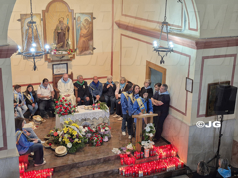Centenars de romeus van acompanyar la pujada del Sant des de l’Església Parroquial de Santa Maria fins a l’ermita on es celebrava una missa i es beneïen els quatre punts cardinals del municipi.