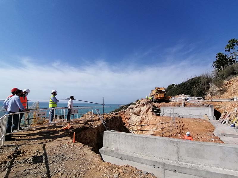 L’alcalde, Andrés Martínez, ha visitat aquest matí les obres i ha pogut comprovar que, després d’haver finalitzat la construcció dels murs d’escullera que reforcen i suporten la carretera en dues de les tres cales afectades, avui han començat els treballs de col·locació de les bigues amb les quals es du a terme la construcció del pont, solució tècnica per a reforçar la zona més afectada, el vial que més va acusar els efectes del temporal i que presentava una clivella en el ferm.
