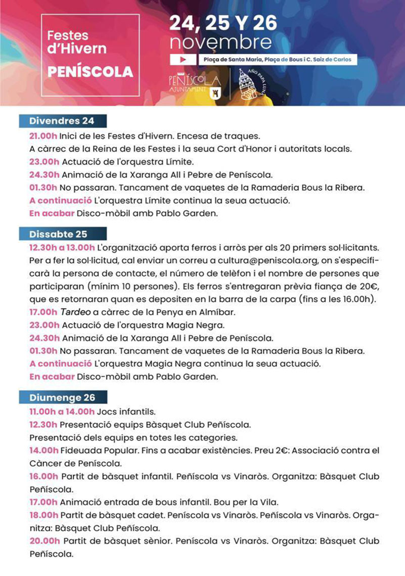 • Entre los día 24 y 26 de este mes, la Ciudad en el Mar celebrará los festejos invernales que incluyen bailes con orquestas, discomóvil, encierros de vaquillas, el día de las paellas, actividades infantiles, fideuà monumental, tardeo a cargo de las peñas festivas y la habitual presentación de equipos del Bàsquet Club Peñíscola.