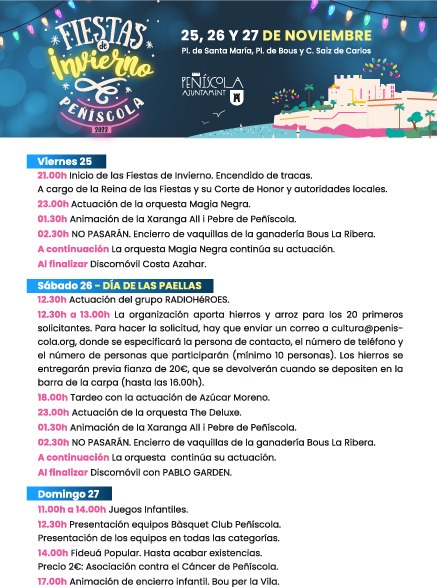 - Entre los día 25 y 27 de este mes, la Ciudad en el Mar celebrará los festejos invernales que incluyen actuaciones musicales, disco-móvil, encierros de vaquillas, el día de las paellas, actividades infantiles y la habitual presentación de equipos del Bàsquet Club Peñíscola