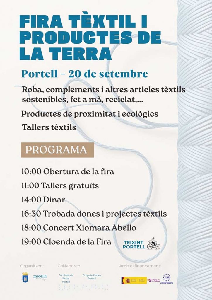 La Fira Tèxtil i Productes de la Terra és una proposta organitzada per l’Ajuntament de Portell i la cooperativa Micel·li, amb la col·laboració de la Comissió de Festes i el Grup de Dones de Portell i el suport del Ministeri d’Igualtat, Institut de les Dones i la Federació Espanyola de Municipis i Províncies (FEMP).