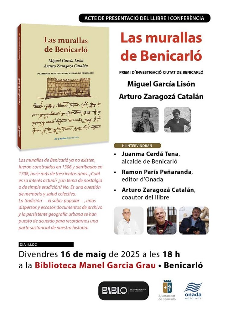 Des d’Onada Edicions us convidem i us agraïm que informeu als vostres mitjans de la conferència i presentació del nou llibre “Las murallas de Benicarló”, el pròxim divendres 16 de maig, a partir de les 18 hores, a la Biblioteca Municipal Manel Garcia Grau.
