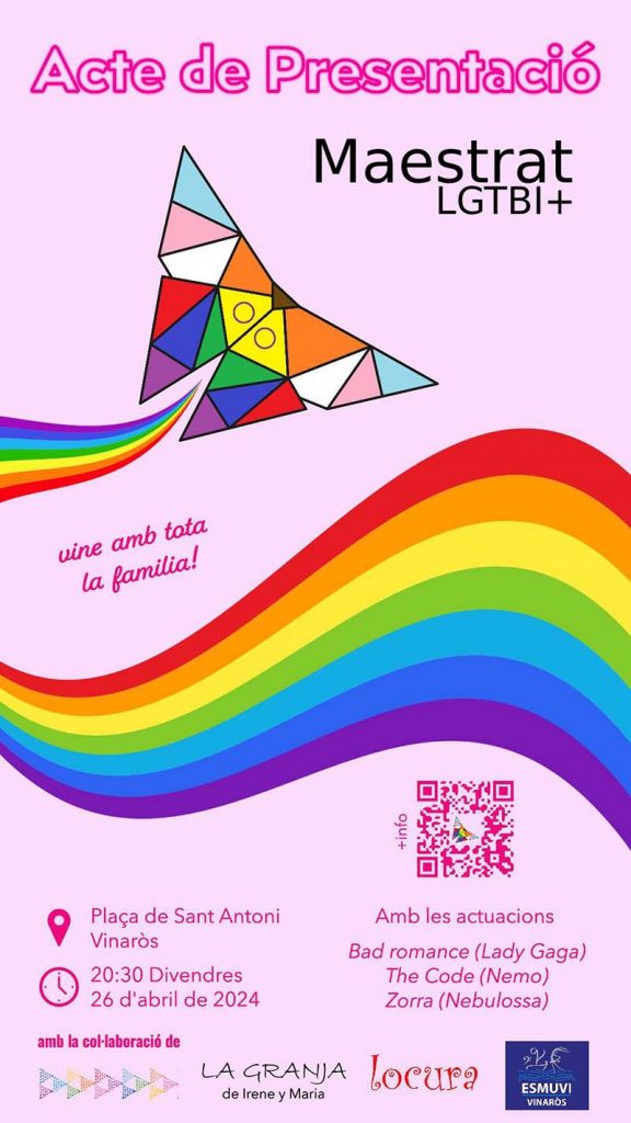 A la plaça de Sant Antoni o també coneguda com a plaça de la Mera, aquest divendres 26 d’abril es realitzarà la presentació de la nova associació amb el nom de Maestrat LGTBI+, aquesta associació naix per a defendre als col·lectius LGTBI+ i a les famílies, per la qual cosa impulsen la participació de totes les famílies.