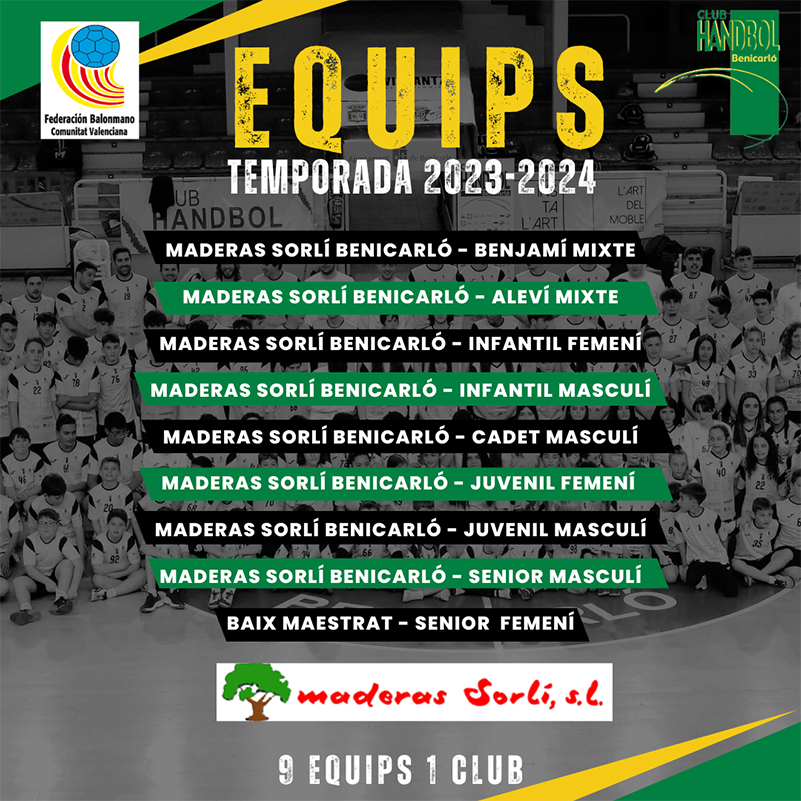 Enguany el club benicarlando comptarà amb un total de 9 equips: 7 de base i 2 sèniors. Tots els equips de la BASE i el Sènior Masculí s’anomenaran “Maderas Sorlí Benicarló”. Per la seua banda, el Sènior Femení que naix de la unió del club amb el “Club Handbol Serra d’Irta” d’Alcalà de Xivert tindrà com a nom “Baix Maestrat Sènior Femení”.