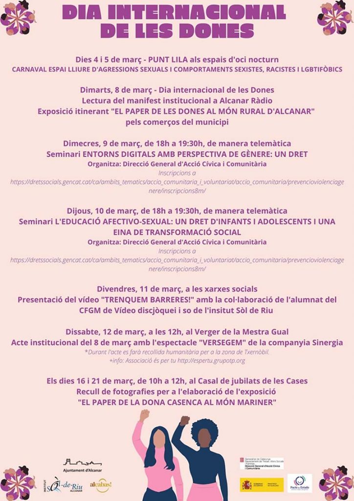 “cada dia ha de ser 8 de març, perquè la lluita per la igualtat entre homes i dones no s’acaba aquest mes” i recorda que la faena de l’Ajuntament en aquesta matèria no s’atura: “sis treballadors i treballadores de l’Ajuntament i tot l’equip de govern està format en perspectiva de gènere. Hem implementat l’Espai Dona i el punt lila i multicolor, també estem elaborant el protocol contra les violències masclistes d’Alcanar i el Pla local de dones, entre altres mesures”. Coincidint amb la celebració de la festa de Carnaval, les dos primeres convocatòries són la instal•lació d’un punt lila i multicolor en els actes nocturns de divendres i dissabte, 4 i 5 de març, com a punt d’informació, assessorament i acompanyament per a víctimes d’agressions als actes festius de lleure nocturns amb l’objectiu que el carnaval d’Alcanar siga un espai lliure d’agressions sexuals i comportaments sexistes, racistes i LGTBIfòbics. El dimarts, 8 de març, Dia Internacional de les Dones, es farà la lectura del manifest institucional a Alcanar Ràdio. També s’inaugurarà l’exposició itinerant “El paper de les dones al món rural del municipi” pels comerços del municipi. El propòsit és retre homenatge a l’esforç constant de totes les dones canareves que han treballat de forma invisible al camp i a les empreses citrícoles de la població i que amb el seu treball han contribuït a la millora econòmica, social i cultural, i han situat Alcanar com a referent en el món dels cítrics. Dimecres i dijous, 9 i 10 de març, es faran dos seminaris telemàtics sobre drets socials en clau de gènere, un sobre entorns digitals amb perspectiva de gènere i l’altre sobre l’educació afectiva-sexual en infants i adolescents com una eina de transformació social. El divendres, 11 de març, a les xarxes socials, es presentarà el vídeo “Trenquem barreres”, amb la col•laboració del CFGM de Vídeo, discjòquei i So de l’Institut Sòl de Riu. El reportatge donarà veu a diferents dones joves del municipi que han estudiat i desenvolupen professions en àmbits històricament masculinitzats amb l’objectiu que arribe, sobretot, a totes les estudiants de secundària de l’institut d’Alcanar que prompte podran escollir si cursen estudis superiors universitaris. En el vídeo, Laia Caudet, estudiant de doctorat en el camp de la neurobiologia del desenvolupament explica que “avui en dia la situació està millorant, però, tot i això, encara veiem l’efecte tisora, on es pot veure com en les etapes inicials de la carrera professional predominen les dones, però a mesura que s’arriba a posicions més altes, sobretot en universitats i centres de recerca, predominen els homes”. Arantxa Fibla, odontòloga, afegeix: “encara avui en dia et trobes amb persones que creuen més amb el criteri d’un home que d’una dona, tot i tenir la mateixa formació. Per sort, aquesta praxi es detecta més amb pacients d’edat avançada que amb els pacients joves.”. Finalment, Alba Fibla, enginyera aeronàutica, posa l’exemple de Katherine Johnson, una matemàtica i física que va treballar a la NASA durant la segona meitat del segle passat: “Gràcies a ella la humanitat va poder viatjar a la lluna, ja que ella calculava trajectòries de vol de moltes de les missions de la NASA, entre les quals les missions Apol•lo”. Una de les seues frases cèlebres fou: “gaudeix de què fas i llavors estaràs fent el teu millor esforç”. Finalment, el dissabte, 12 de març, a les 12 h, al Verger de la Mestra Gual, se celebrarà l’acte institucional del 8 de març amb l’espectacle de poesia recitada i musicada a càrrec de la “Cia. Sinergia”, amb Clàudia Amela, Aida Mayor i Francesc Subirats. Durant l’acte es farà la recollida humanitària de menjar i medicaments per a la zona de Txernòbil. D’altra banda, els dies 16 i 21 de març, de 10 a 12 h, al Casal de Jubilats de les Cases, es farà el recull de fotografies per a l’elaboració de l’exposició “El paper de la dona casenca al món mariner” que organitzarà l’Ajuntament d’Alcanar per a posar en valor, també, el rol de la dona casenca en l’economia i la subsistència de l’ofici mariner a les Cases d’Alcanar.]]>