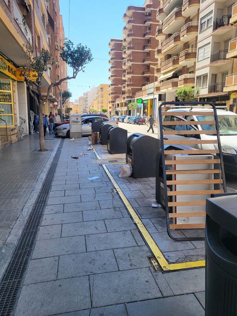 Una vez más, nos encontramos un somier y suciedad esparcidos delante de la zona de los contenedores de l’Avinguda País Valencià.