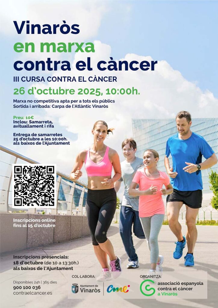 La “IIIª Marxa Contra El Càncer” a Vinaròs se celebrarà el proper 26 d’octubre a les 10:00 h, dins dels actes per commemorar el Dia Mundial Contra el Càncer a la capital del Baix Maestrat. La cursa està organitzada per l’Associació Espanyola Contra El Càncer de Vinaròs, amb el suport de l’Ajuntament i el Consell Municipal d’Esports.