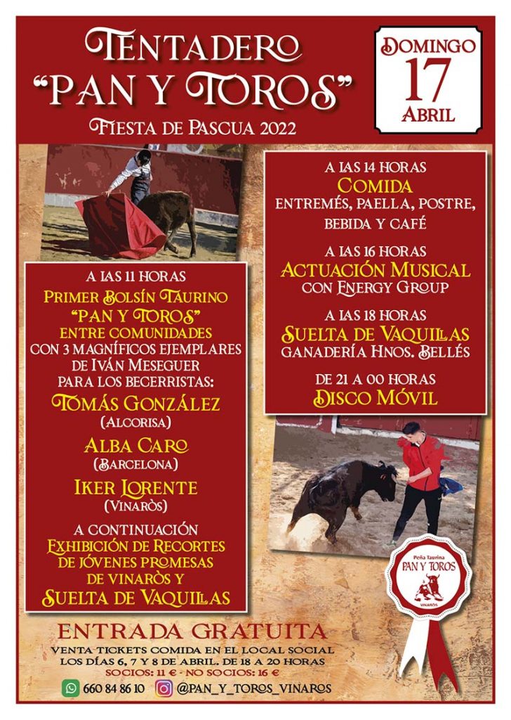 - La Peña Taurina Pan y Toros de Vinaròs ha organizado su tradicional Fiesta de Pascua el Domingo 17 de Abril, en una completa e interesante jornada en la que habrá toreo, recortes, vaquillas, música en directo, comida y discomóvil, con el aliciente de que la entrada es libre y gratuita todo el día.