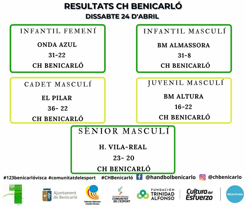 El dissabte van jugar els dos infantils, el cadet masculí, el juvenil masculí i el sènior masculí. Només l’equip juvenil va aconseguir emportar-se la victòria enfront de l’Altura (16 a 22). L’infantil femení no va poder front l’Onda (31 a 22), el masculí va perdre enfront de l’Almassora (31 a 8). Tampoc el cadet va poder continuar en la seua ratxa de victòries i va perdre enfront de “El Pilar” (36 a 22). El sènior masculí en el primer partit del cap de setmana no va poder a casa del Vila-real on va perdre per un ajustat 23 a 20.