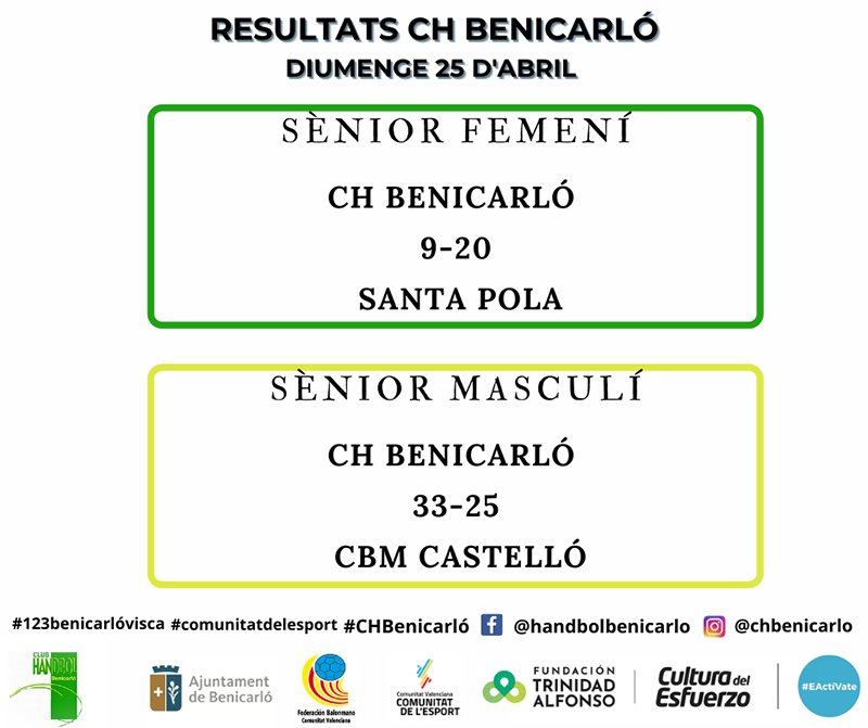 El diumenge jugaven els dos sèniors al Poliesportiu de Benicarló. Les xiques no van poder enfront del Santa Pola i van perdre 9 a 20. Per la seua part, el sènior masculí sí que va guanyar, i amb contundència, al Castelló per un 33 a 25.