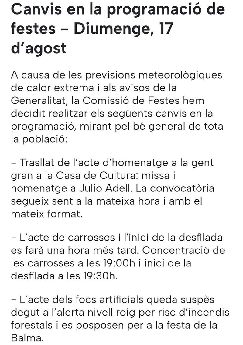 Rossell també ha modificat part de la seva programació i ajorna els focs de final de festes 2025
