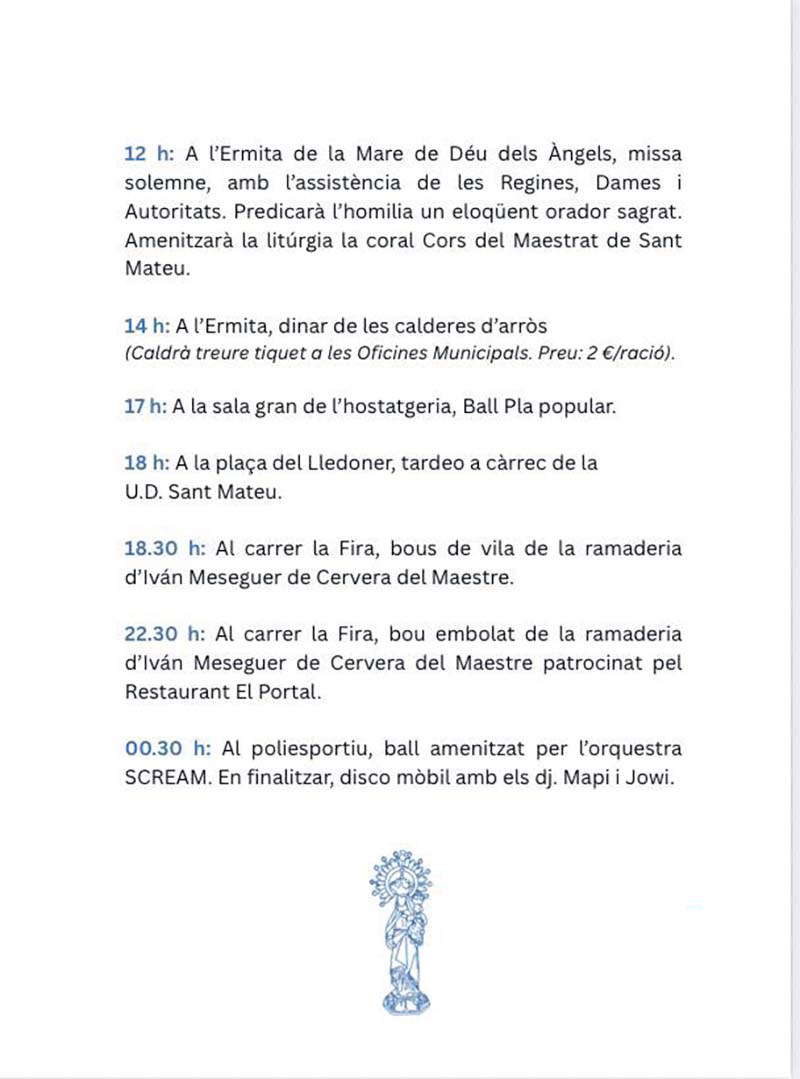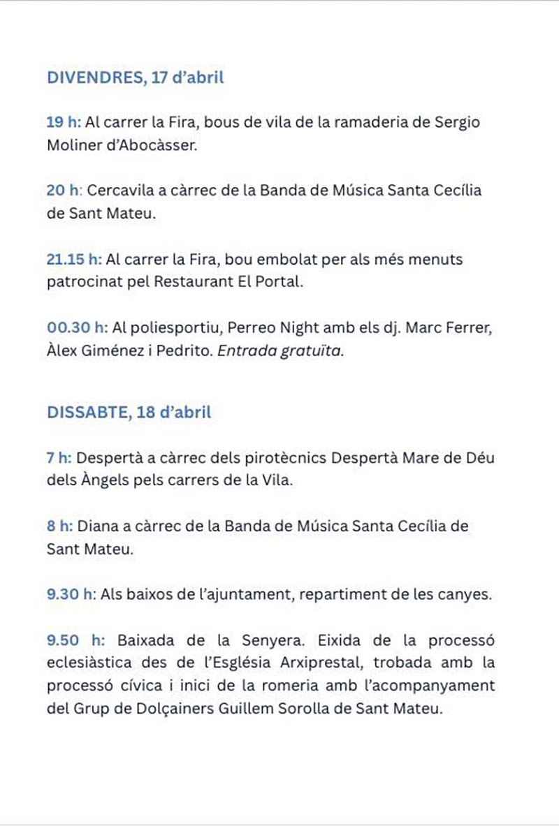 L’Ajuntament de Sant Mateu ha presentat la programació de la festivitat de la Mare de Déu dels Àngels 2026, que tindrà lloc del 17 al 19 d’abril.