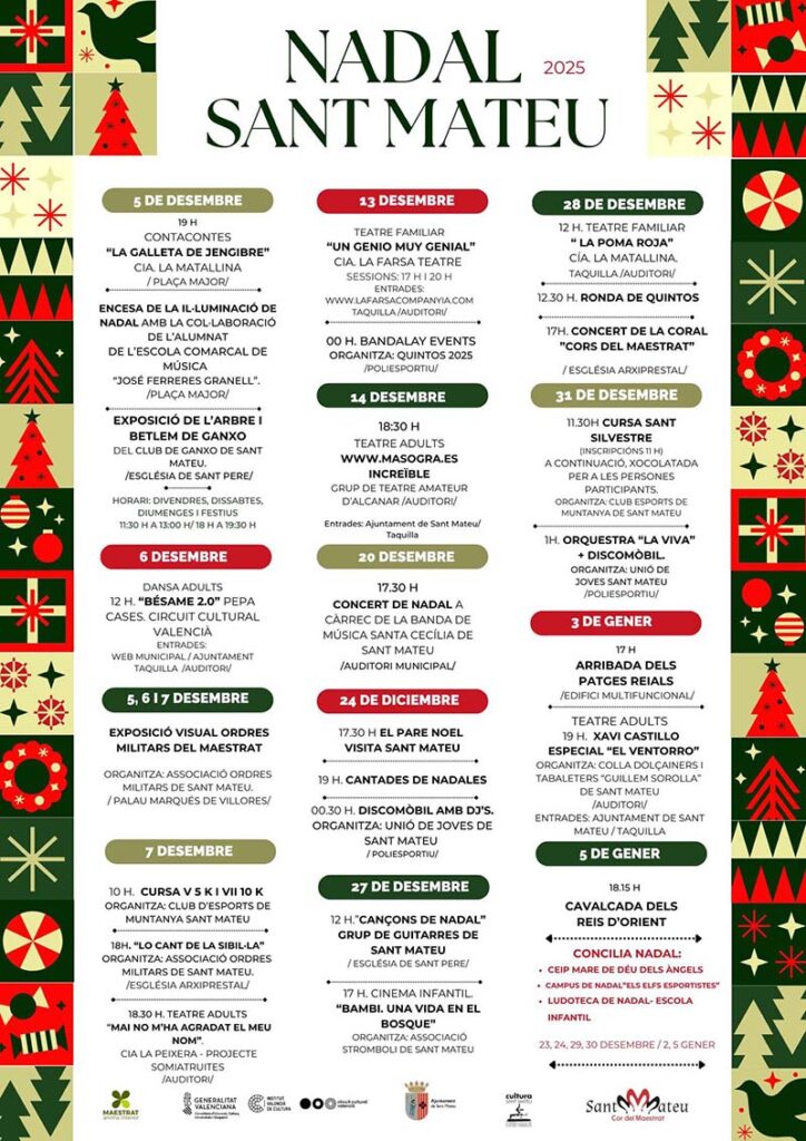 L’Ajuntament de Sant Mateu ha fet pública la programació de Nadal 2025/2026, una agenda festiva que arriba carregada d’activitats culturals, lúdiques i educatives pensades per a tota la ciutadania. Les propostes s’han organitzat en col·laboració amb les diferents associacions locals, que any rere any contribueixen a omplir el municipi d’esperit nadalenc i convivència.