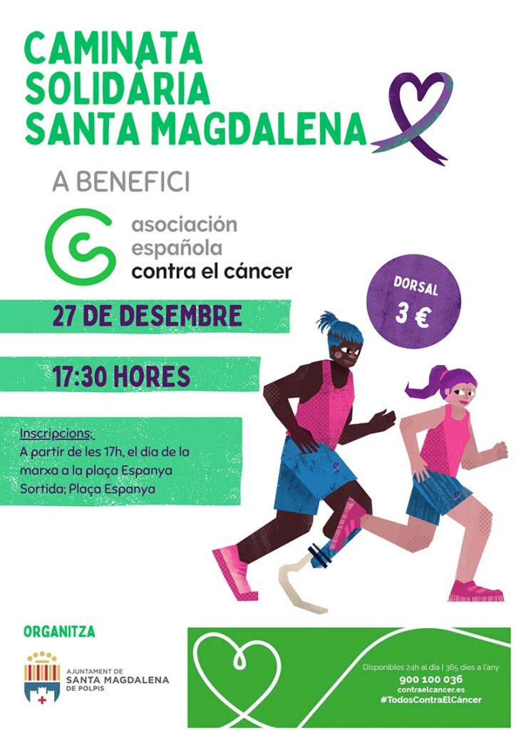 D’altra banda, el dia 27 de desembre, a les 17.30h, tindrà lloc una caminada solidària a benefici de l’Associació de Lluita contra el càncer. El preu del dorsal és 3€ i la inscripció es realitzarà el mateix dia de la marxa a partir de les 17h en la plaça Espanya, punt des d’on partirà la marxa.