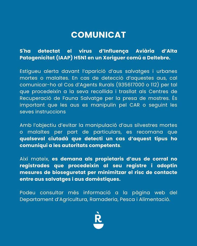 Es demana a la ciutadania que no manipuli aus mortes o malaltes i que avisi el Cos d’Agents Rurals (935617000 o 112) si en troba alguna.