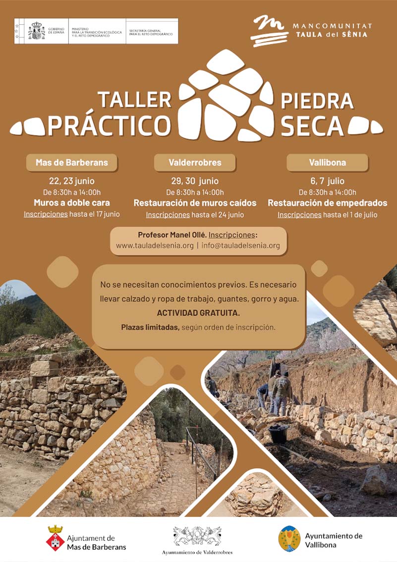 La Mancomunitat Taula del Sénia, gràcies a l’ajuda del Ministeri per a la Transició ecològica i el Repte demogràfic (126.882€) realitza el Taller “Pedra seca del Territori Sénia” per formar 7 treballadors durant 6 mesos en l’aprenentatge de la restauració de construccions de pedra seca, que duu a terme un docent amb formació i experiència. Les actuacions s’han fet a Rossell, Herbers, Pena-roja de Tastavins, Godall i Castell de Cabres, alguns dels municipis més petits de la Mancomunitat. Cal destacar que el 18 abril va estar Paco Boya, Secretari General de Repte Demogràfic del Ministeri.