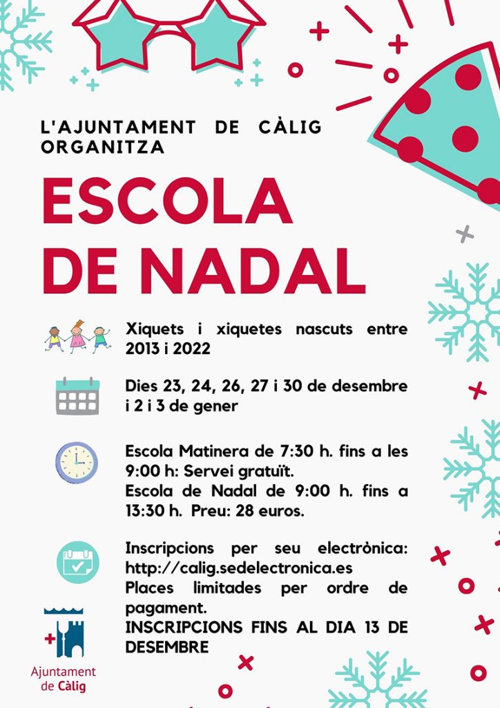 Cal assenyalar que durant les vacances nadalenques es mantindrà el servei gratuït de l’Escola Matinera de 7:30h a 9:00h, mentre que l’Escola de Nadal s’oferirà des de les 9:00h fins a les 13:30h amb el preu de 28€.