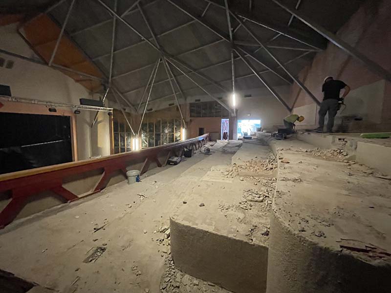L’alcalde Jordi Jordan, acompanyat de la primera tinenta d’alcaldia i regidora de Cultura, Mar Lleixà, i del regidor d’Obres Públiques, Jaume Bel, ha visitat avui els treballs, que han començat amb la retirada de les butaques i l’aixecament del paviment de fusta tant de la platea com de l’amfiteatre.
