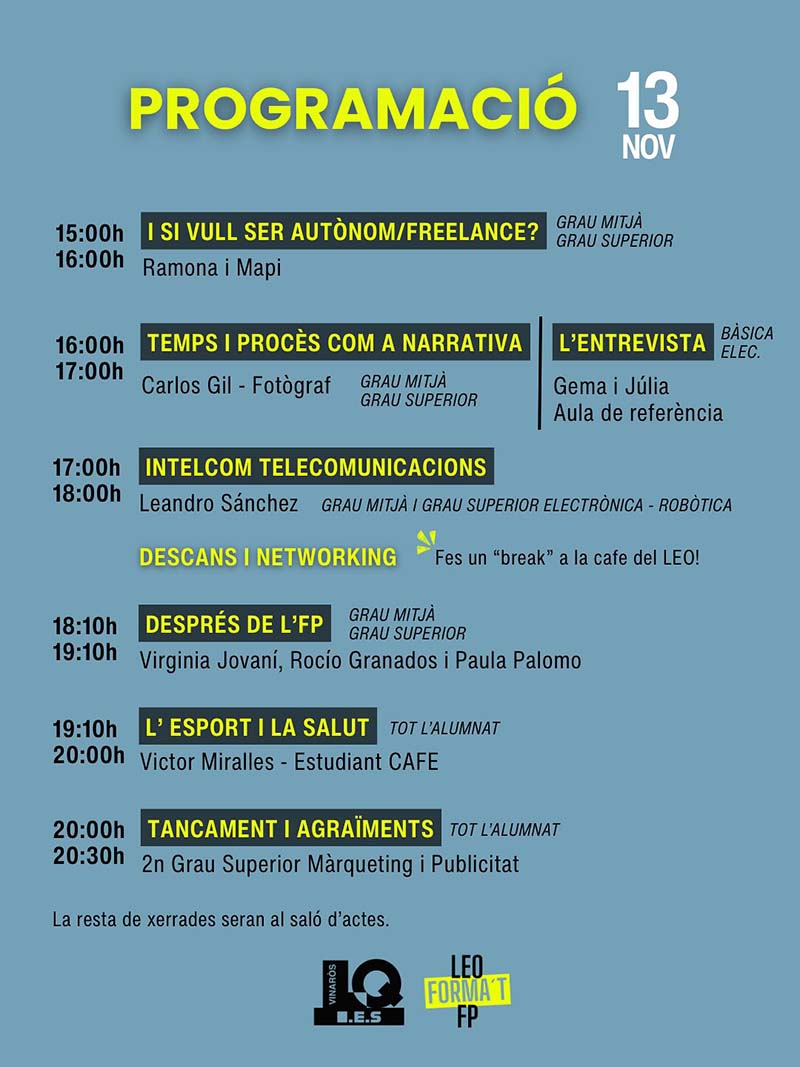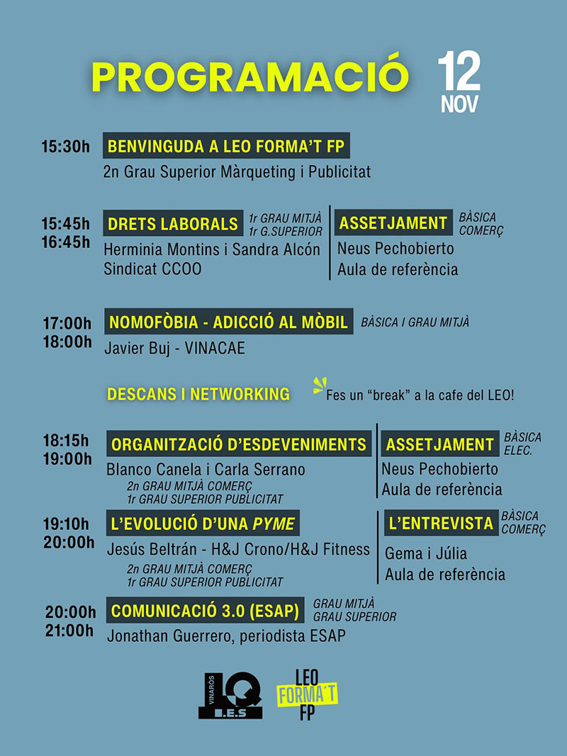 Les jornades tècniques “Leo Forma’t FP” han presentat, a través del seu canal de difusió, els darrers ponents per a les xerrades que es realitzaran durant els dies 12 i 13 de novembre de 16:00 h a les 20:00 h a l’IES Leopoldo Querol.
