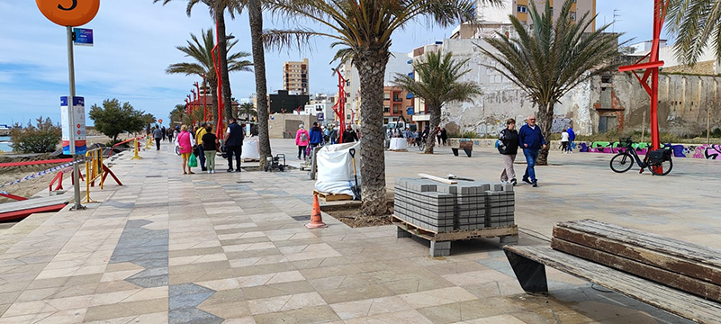 En primer lloc, hem de dir que els treballs que s’estan fent amb les palmeres de la localitat van consistir en primer lloc en la retirada dels tablons que es trobaven prop de les soques de l’arbre, ja que s’estaven soltant i això podria causar problemes als viandants. Seguidament, s’ha realitzat un canvi, en el qual s’han col·locat uns totxos de colors gris en la zona on estaven situats els tablons.