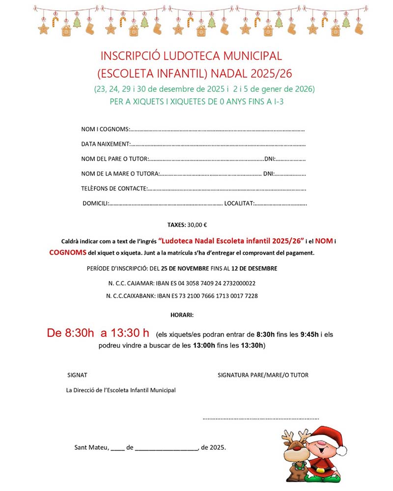 🏦 Pagament: Cajamar i Caixabank (indicar “Ludoteca Nadal Escoleta Infantil 2025/26” + nom del xiquet/a)