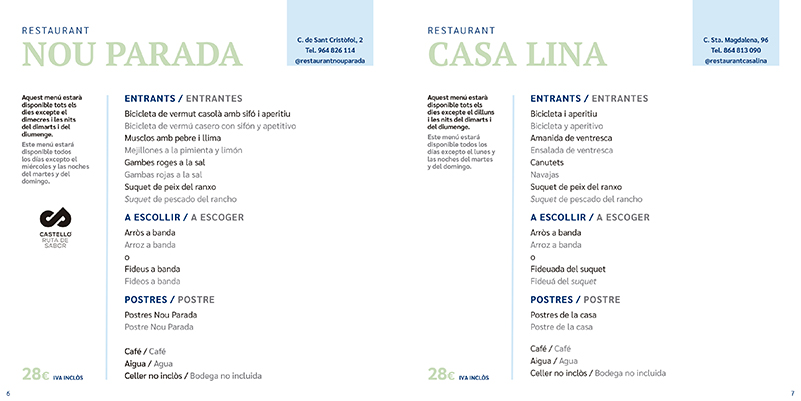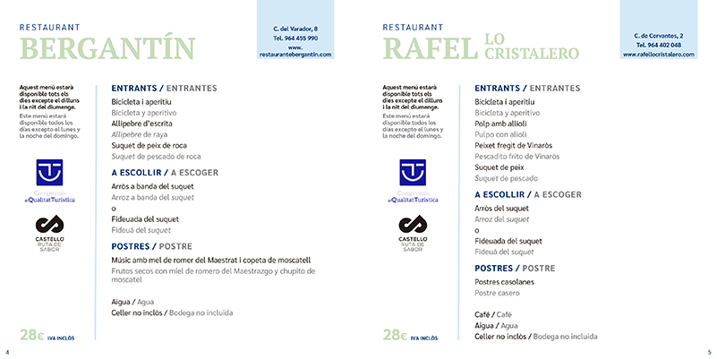 Els establiments participants són Bergantín, Rafael Lo Cristalero, Nou Parada i Casa Lina. Cada xef ha preparat menús originals amb tres o quatre entrants a escollir, plat principal que inclou arròs o fideuà del suquet i postres a escollir, amb aigua i cafè inclòs, celler a banda, al preu únic de 28€ perquè els comensals més exigents queden satisfets.