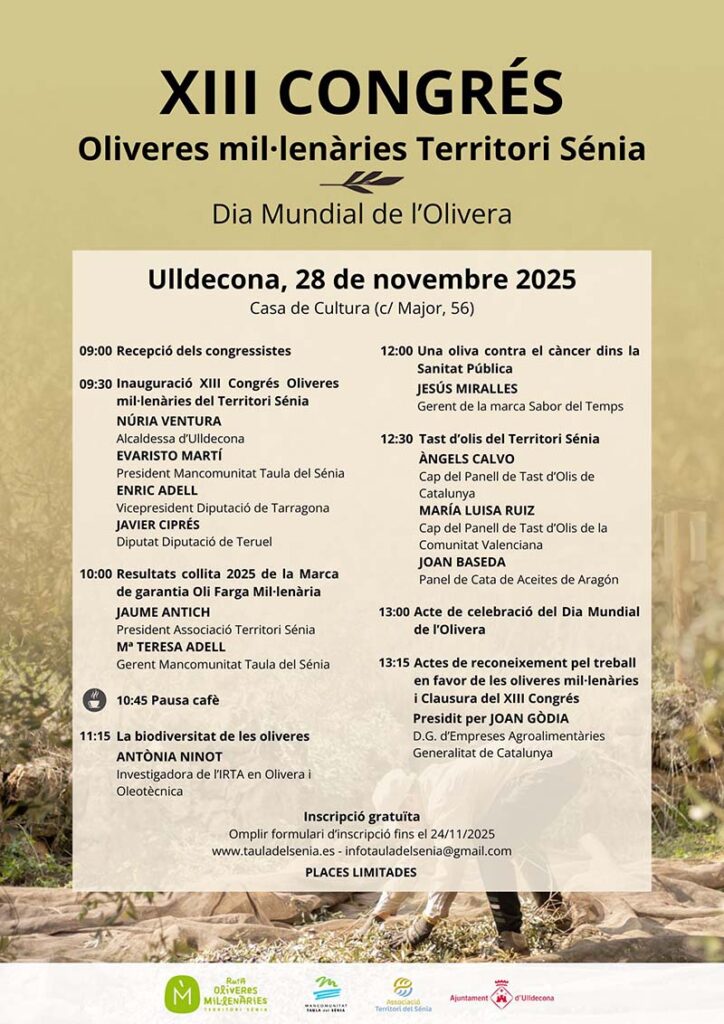 El congrés també permetrà donar visibilitat al model de gestió i a les iniciatives turístiques, gastronòmiques i mediambientals que s’estan desenvolupant entorn de les oliveres mil·lenàries, un símbol identitari de les comarques del Sénia i un recurs de gran valor per al desenvolupament sostenible del territori.