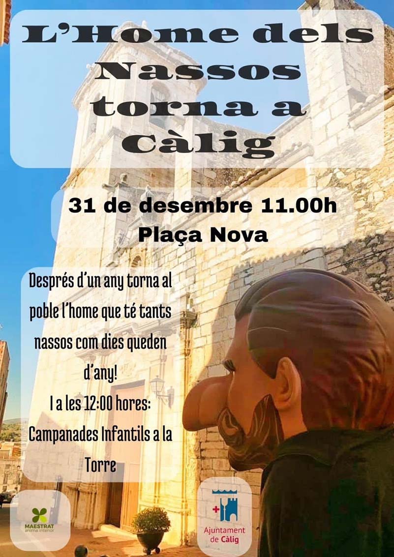 Demà diumenge 31 a les 11:00 del matí, a la plaça Nova, us trobareu a l’Home dels Nassos. Seguidament, a les 12:00 hores a la Torre, se celebraran les campanades infantils.