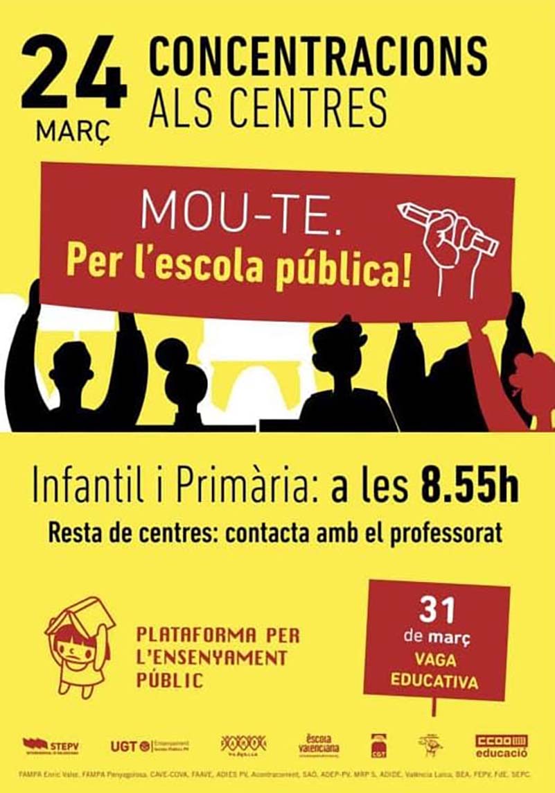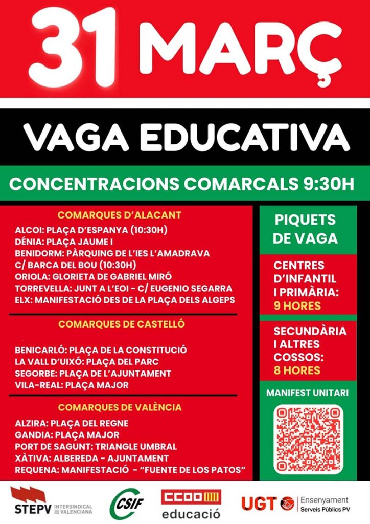 El pròxim dimarts 31 de març, el professorat, personal d’atenció educativa i d’administració i serveis estem convocats pels sindicats STEPV, CSIF, CCOO i UGT a fer una vaga educativa per atendre millor el nostre alumnat i per recuperar condicions laborals retallades.