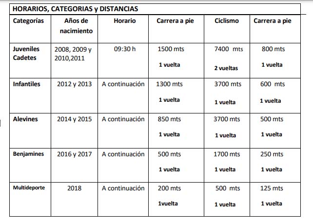 - El control de material y entrada a la transición será de 8:30h a 9:15h para las categorías Juveniles, Cadete e Infantil, y hasta 15 minutos antes de la prueba para el resto de categorías.