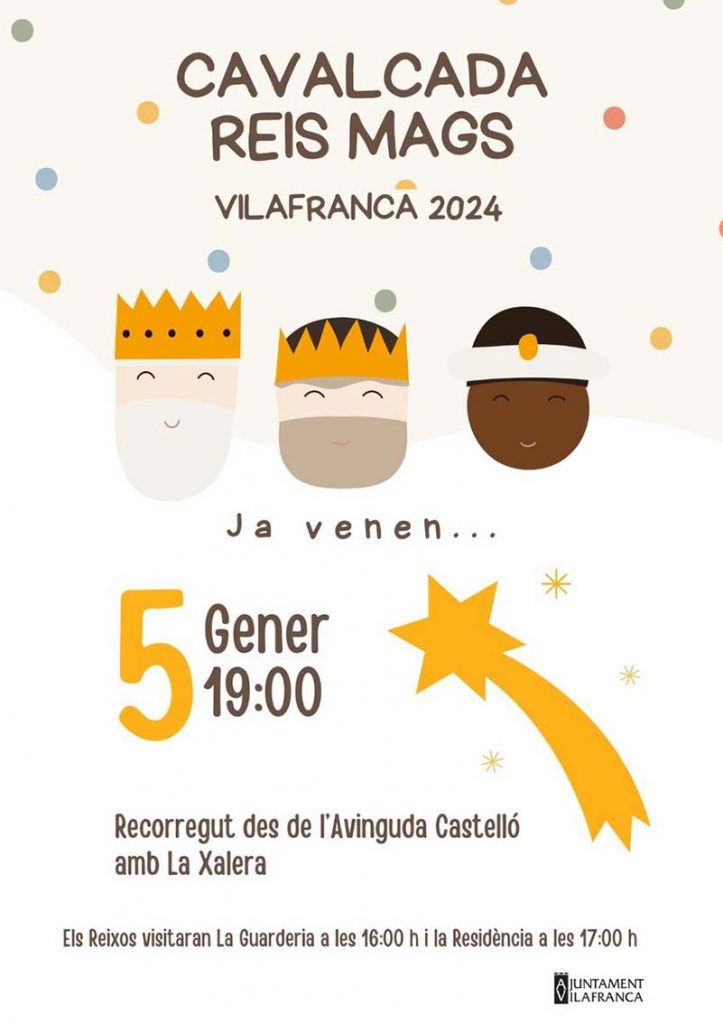 • L’Ajuntament de Vilafranca i l’associació La Xalera estan ultimant tots els detalls per a rebre als Reis d’Orient el pròxim 5 de gener. A més, els xiquets i les xiquetes de Vilafranca també s’estan preparant per a rebre’ls a la cavalcada.