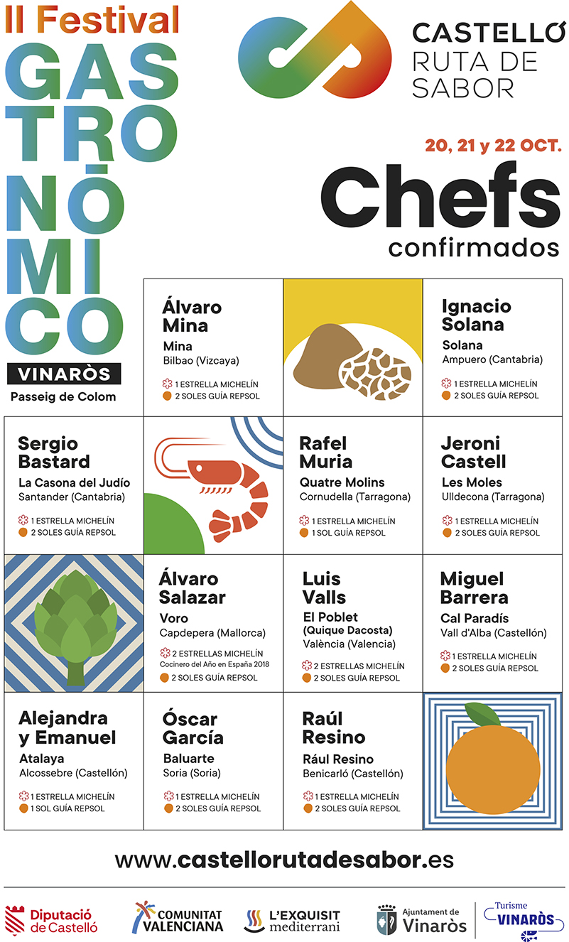 El festival comptarà amb la participació dels cuiners més reconeguts de la província, guardonats amb una estrella Michelin, com Alejandra Herrador i Emanuel Carlucci del restaurant Atalaya d’Alcossebre, Raúl Resino del restaurant Raúl Resino de Benicarló i Miguel Barrera del restaurant Cal Paradís de Vall d’Alba, així com xefs de Sòria, Ulldecona, Santander o Bilbao. També es comptarà amb la participació del xef vinarossenc, Rubén Miralles, reconegut amb un Sol Repsol.