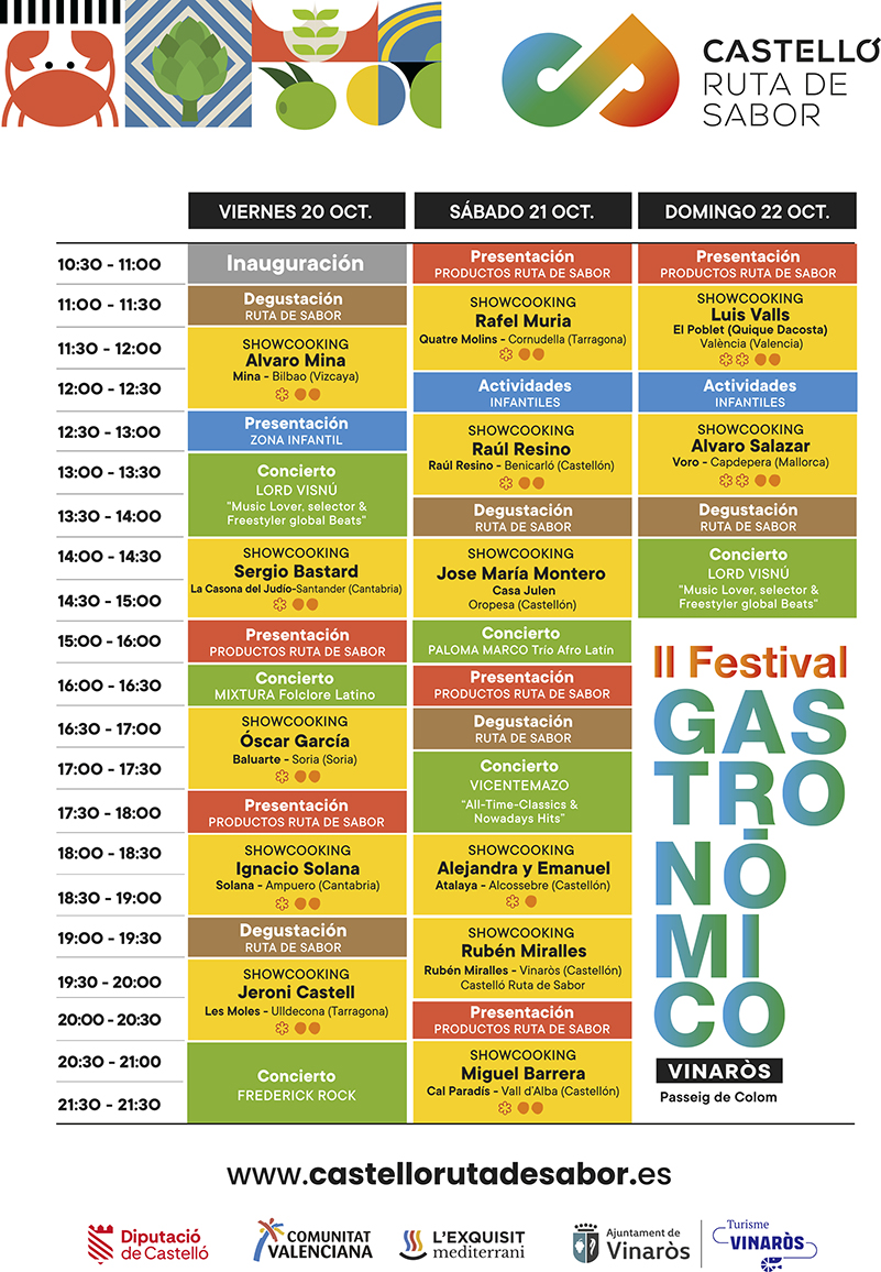 D’altra banda, també hi haurà una zona expositiva per a productors i restauradors vinculats a la marca Castelló Ruta de Sabor, barra, espais per al descans dels visitants, activitats infantils i escenari per a la celebració d’un extens programa de showcookings a càrrec d’altres estrelles Michelin i cuiners de reconegut prestigi de dins i fora de la província. Vinaròs Gastronòmic també estarà present amb un espai expositor per a mostrar les creacions culinàries i sorprenents que elaboraran els xefs locals.