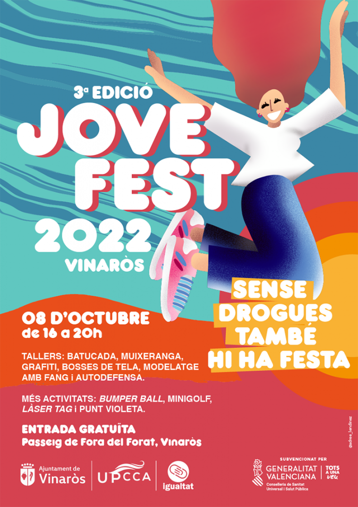 Aquest dissabte 8 d’octubre se celebrarà el 3er JoveFest amb el lema “Sense drogues també hi ha festa”, amb l’objectiu d’oferir entreteniment de qualitat per als joves dintre de la campanya d’oci i temps lliure de la Unitat de Prevenció Comunitària de Conductes Addictives, UPCCA. La regidora de Política Social, Amalia Cabós, destaca que “enguany, amb aquesta tercera edició, es consolida aquesta jornada d’activitats per als joves, amb alternatives positives d’oci i temps lliure per fomentar l’entreteniment saludable com una eina per a combatre conductes i consums no desitjables”.