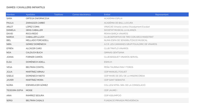 En referència a la representació infantil, un total de 20 dames i cavallers infantils, entren en el sorteig de rei o reina de les festes, ells són: