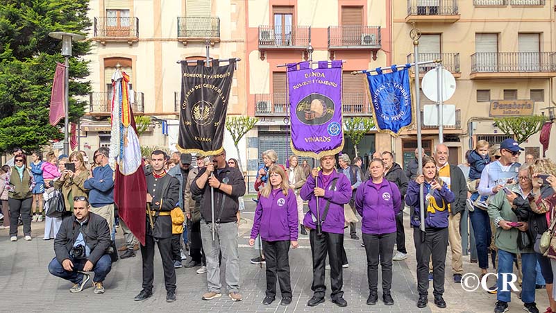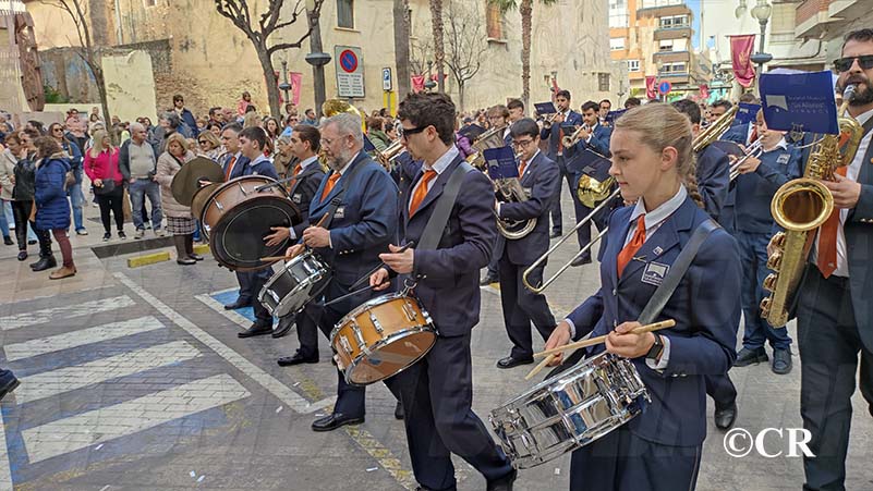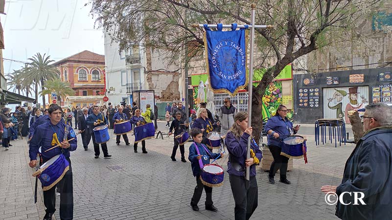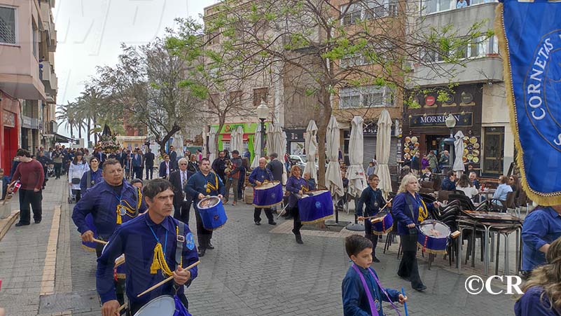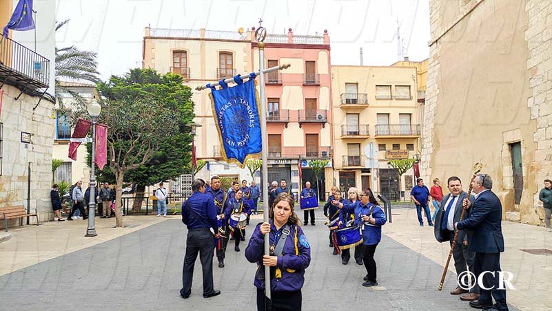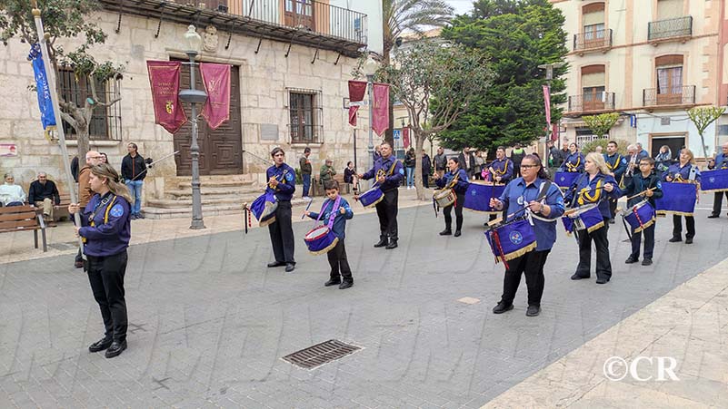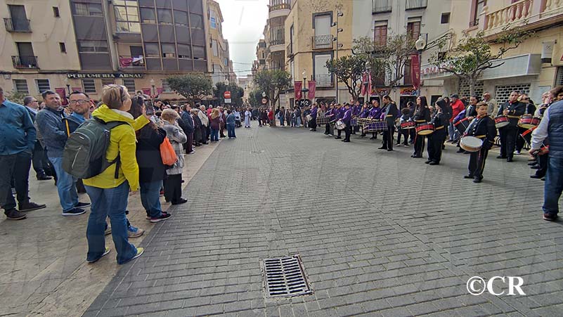 Al mateix temps, les diferents Bandes de Bombos i Tambors han entrat cap a la Plaça Sant Valent: la Banda de Bombos i Tambors del Cristo de la Paz pel carrer San Cristòfol, la del Crist dels Mariners pel carrer Santa Ana i la de la Confraria de Jesús Cautivo i Ntra Sra de la Merced per carrer de l’Angel.
