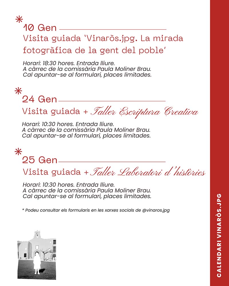 Totes les activitats són gratuïtes i requereixen inscripció prèvia mitjançant un formulari disponible a les xarxes socials del projecte @vinaros.jpg. Amb aquest calendari, Vinaròs.jpg reforça la seua vocació participativa i educativa, convertint l’exposició en un espai viu per mirar, dialogar, recordar i crear conjuntament.