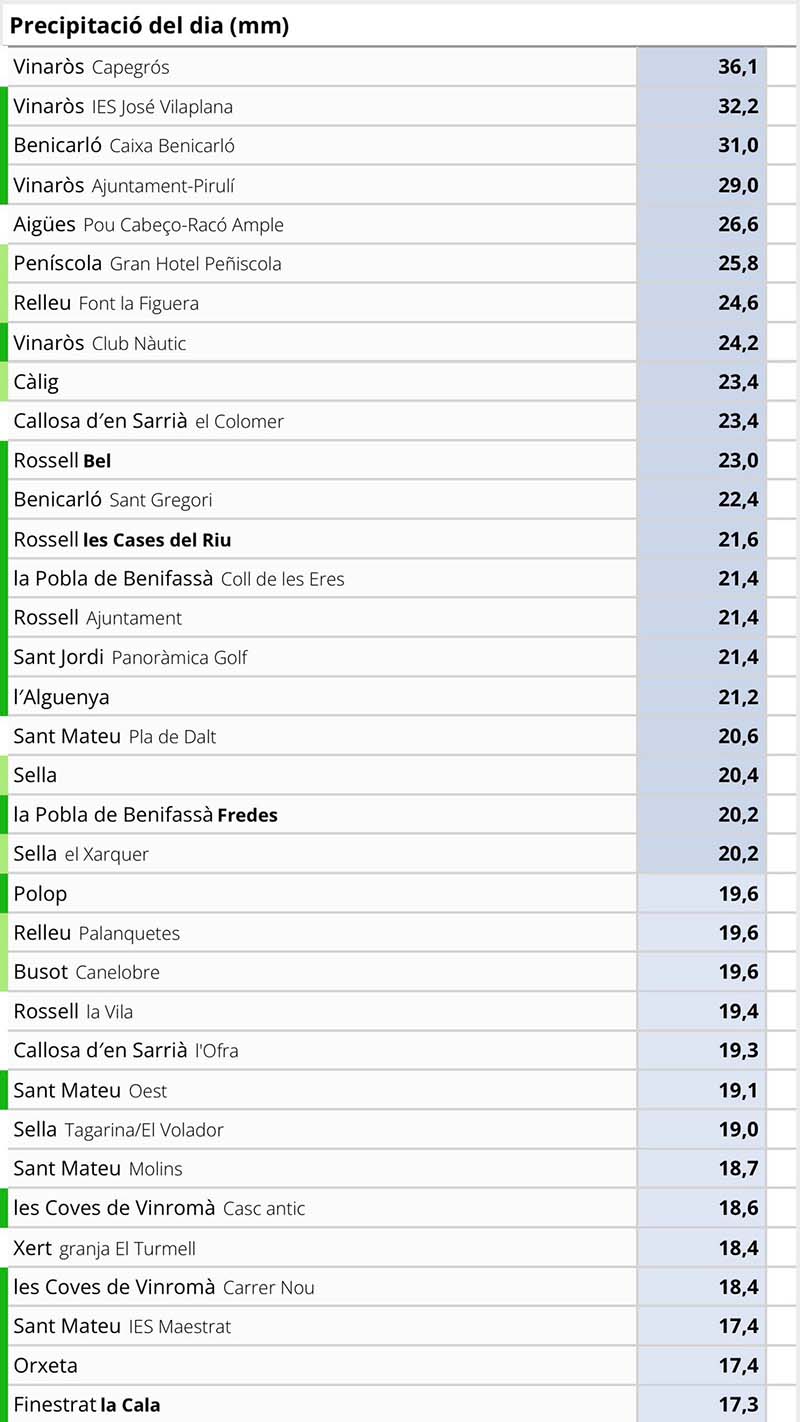 En segon lloc se situa Benicarló, on es van registrar 31,0 mm de precipitació durant la mateixa jornada.