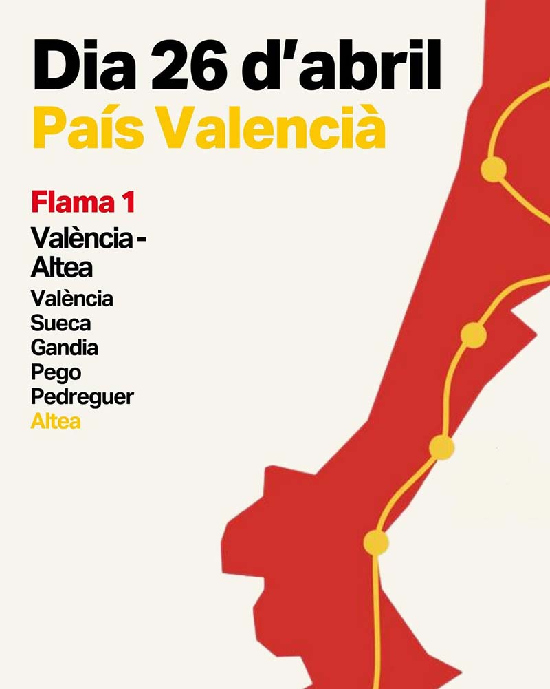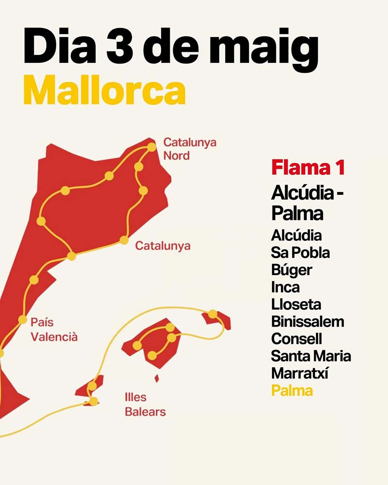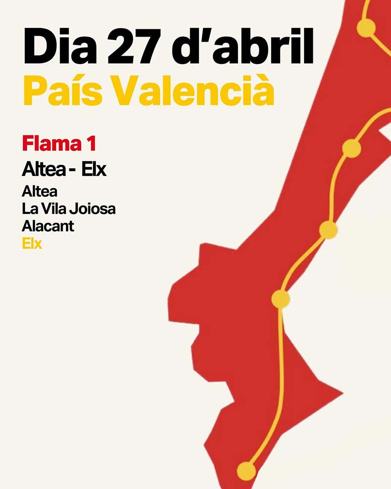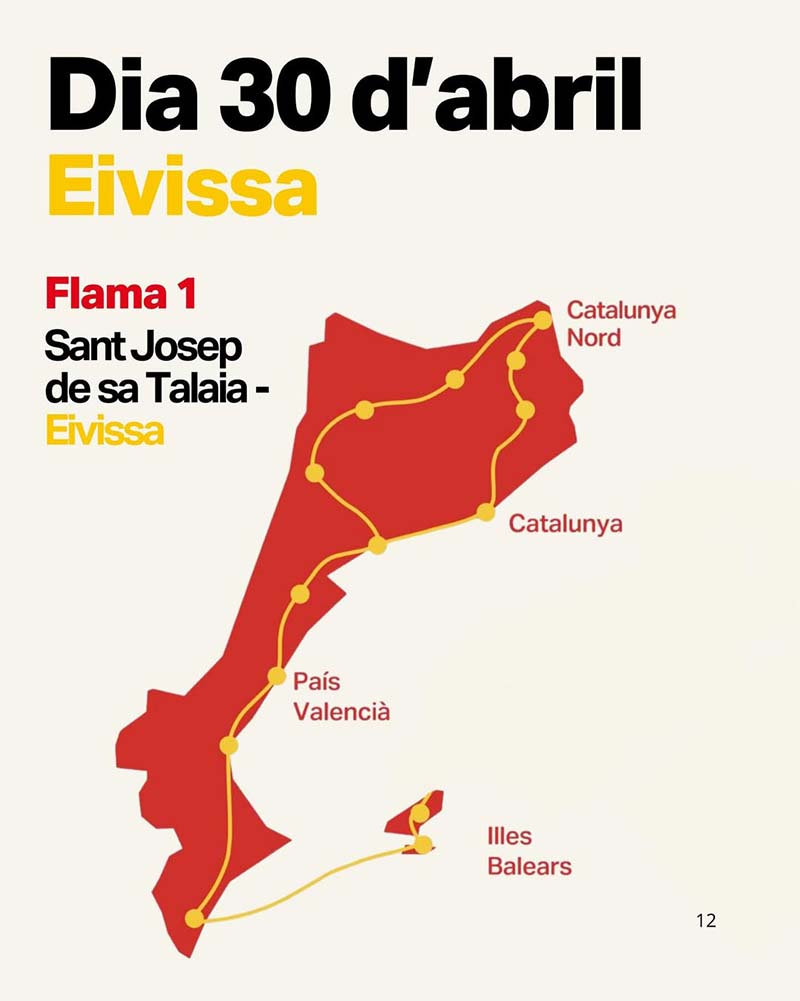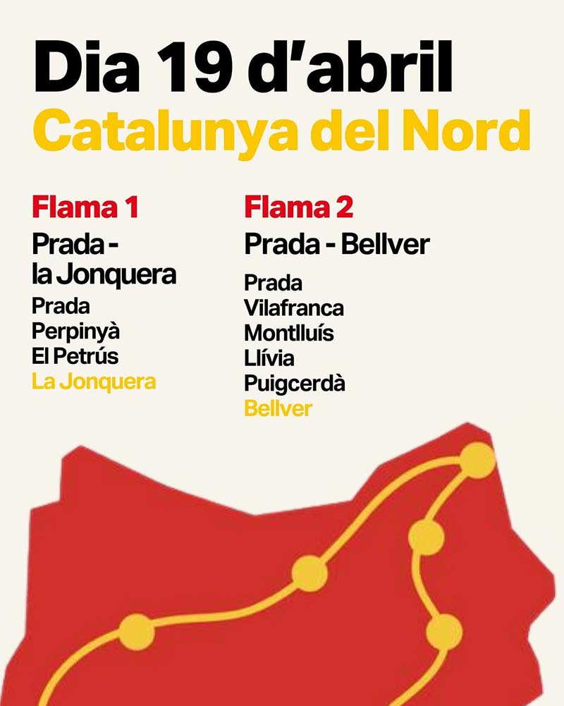 El recorregut combinarà trams correns amb trams amb bicicleta, en una jornada on el Pas de la Flama donarà lloc a un conjunt d’actes culturals, lectures de manifestos i festes populars.