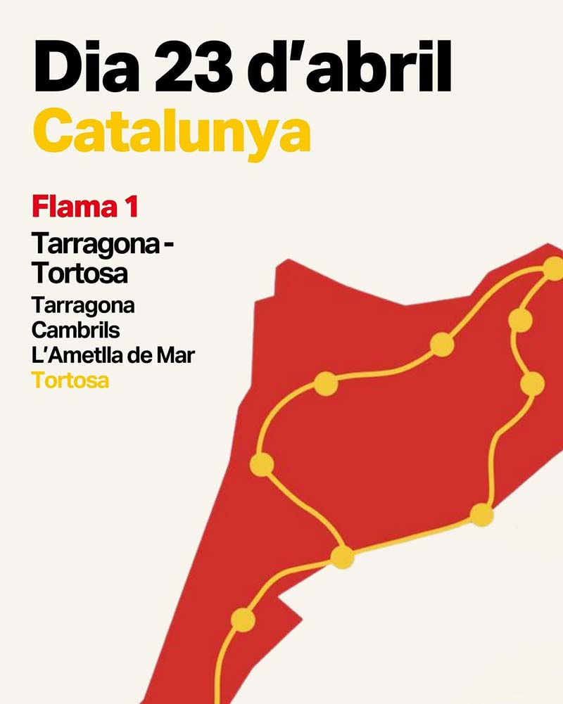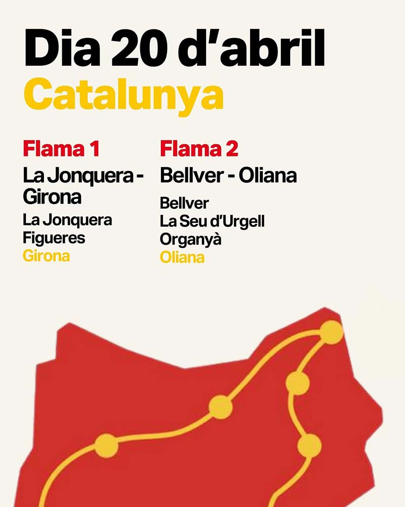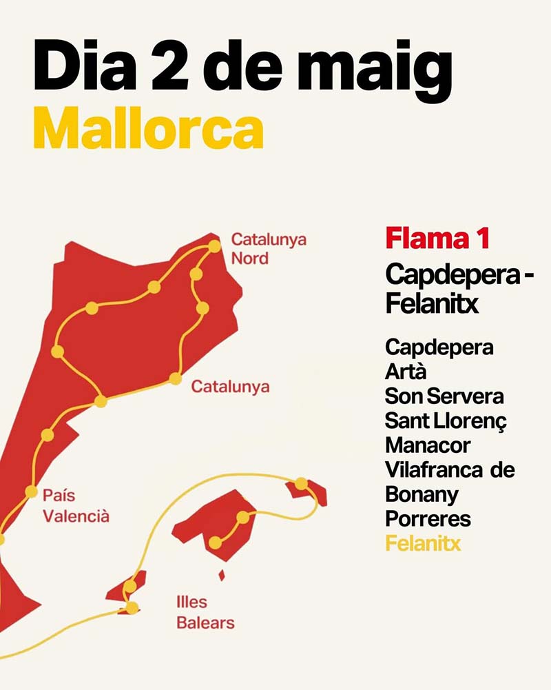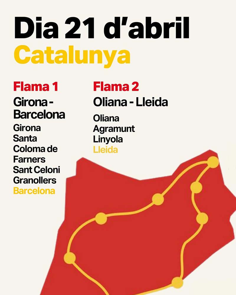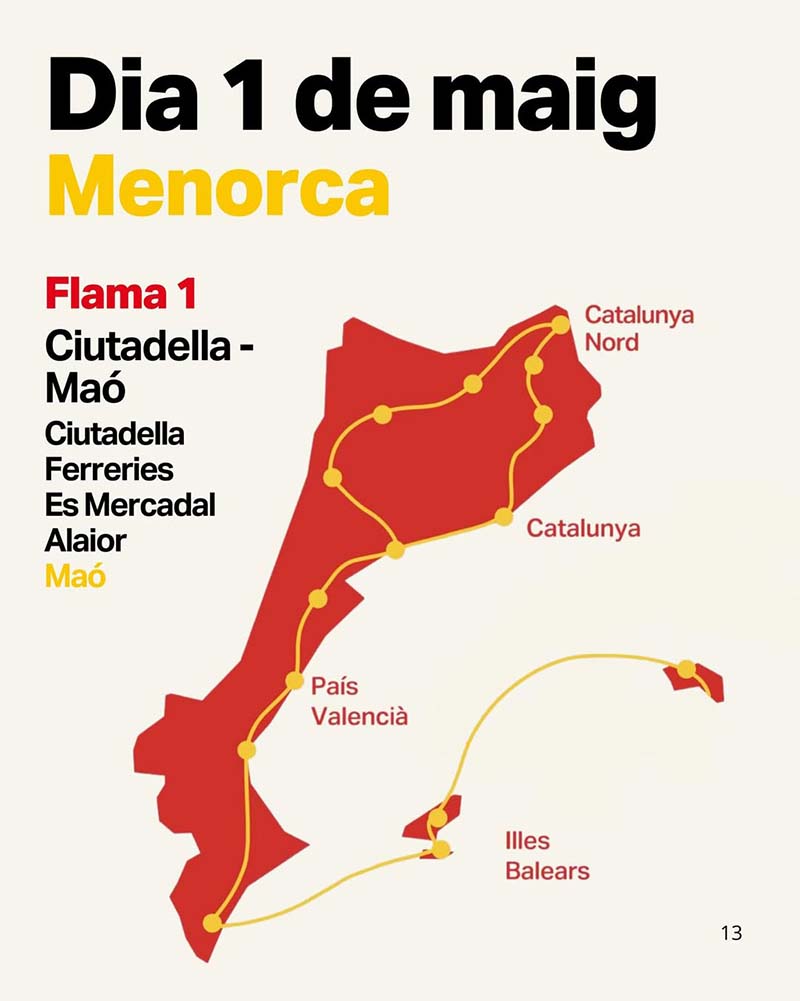 El recorregut combinarà trams correns amb trams amb bicicleta, en una jornada on el Pas de la Flama donarà lloc a un conjunt d’actes culturals, lectures de manifestos i festes populars.